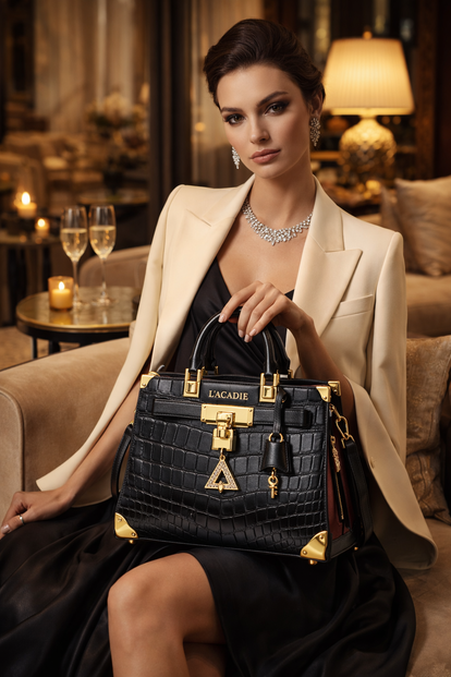 L’ACADIE Noir Exécutif is a statement of authority and refinement. Meticulously crafted from premium crocodile-embossed leather and finished with polished gold hardware, this structured handbag embodies quiet power and timeless elegance. Designed for women who lead with confidence, it transcends trends and stands as a symbol of legacy, discretion, and enduring luxury.
