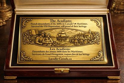 L’ACADIE Noble Heritage is a 12×18 inch gold-plated tribute to Acadian history, resilience, and pride. Crafted with fine detail, this heritage plate honors generations who endured, preserved their identity, and built a lasting legacy.