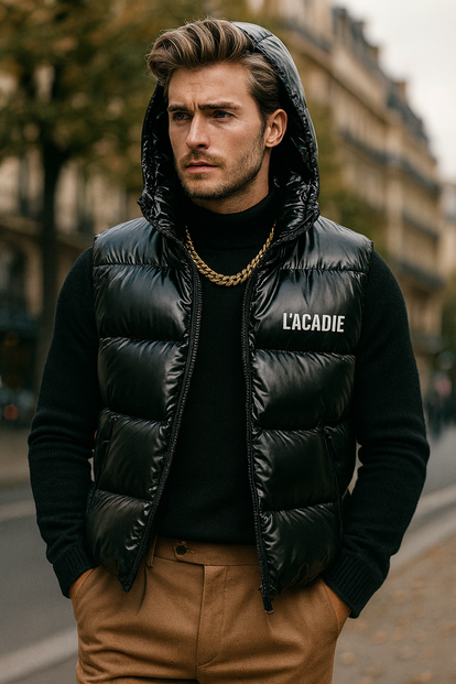 L’ACADIE Ébène Pure est un gilet noir minimaliste, conçu avec précision et des matériaux luxueux. Ses lignes épurées et son design raffiné en font une véritable déclaration d’élégance moderne.