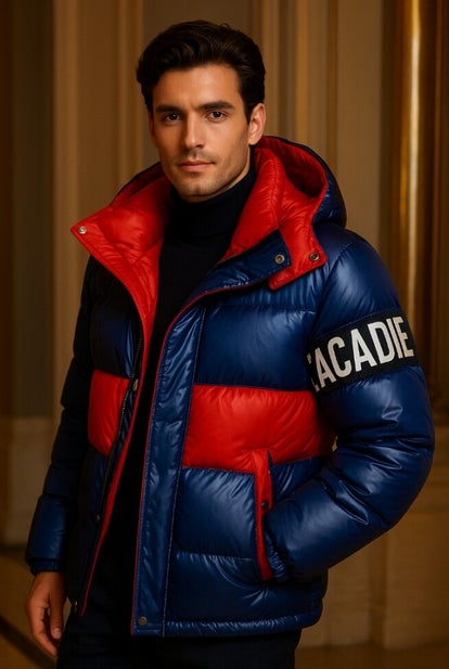 L’Acadie Flamme – A striking fusion of cobalt blue and fiery red, designed for the modern connoisseur of style. Sleek lines, refined craftsmanship, and the iconic L’Acadie logo make this jacket a bold statement of elegance and confidence.